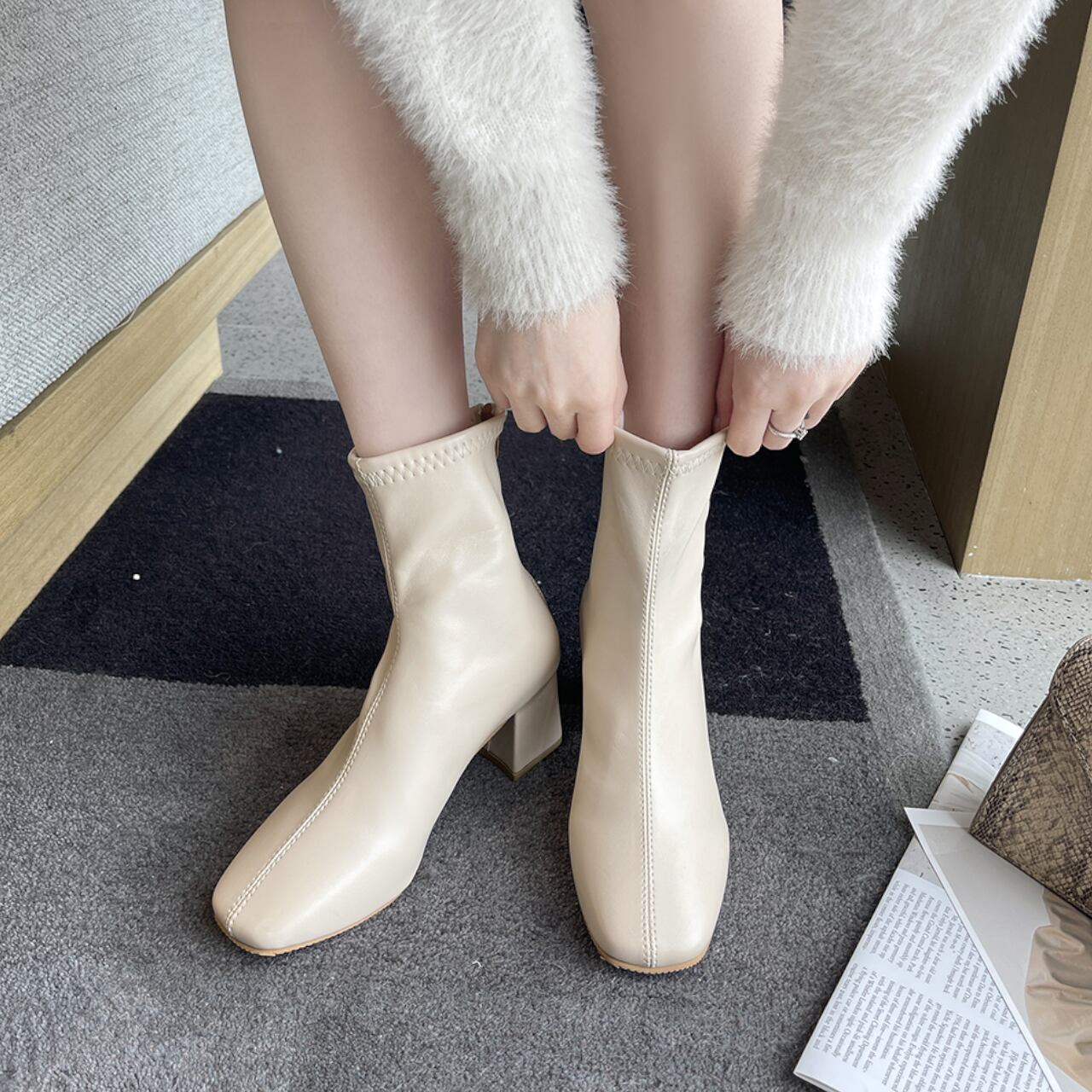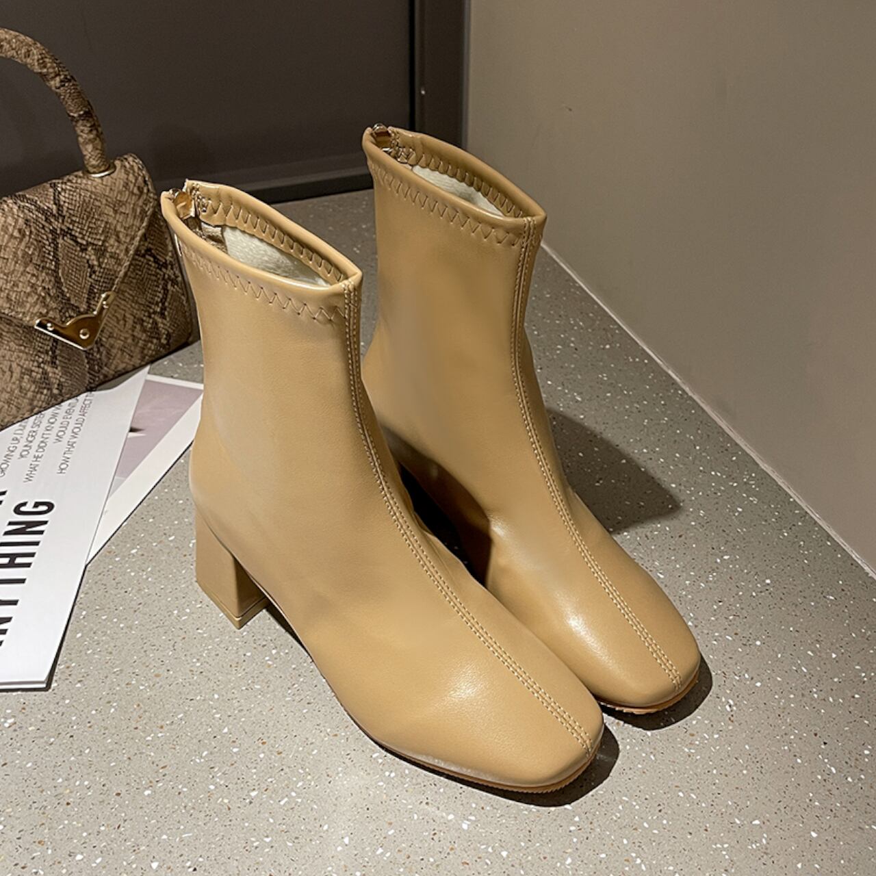 このショートブーツは、スクエアトゥと太ヒールが特徴のきちんと感を与える一足です。