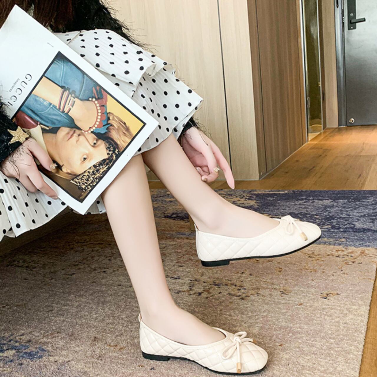 キルティングやフラットリボンが可愛らしいデザインで、正統派のバレエシューズとスクエアトゥパンプスを融合したようなデザインに仕上がっています。