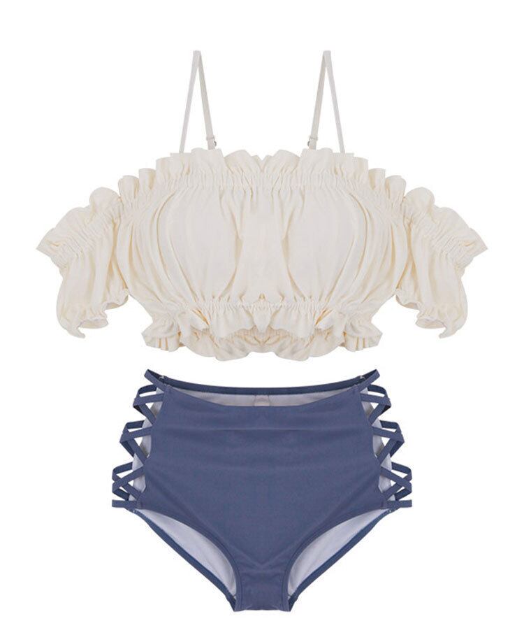 水着 ビキニ タンキニ 体型カバー水着 セパレート オフショルダー オフショル フリル ハイウエスト 胸元 上下セット かわいい シンプル おしゃれ キュート ガーリー 無地 10代 20代 30代 レディース 女性用 女の子 夏 海 ビーチ プール リゾート 旅行 着痩せ 韓国 オルチャン ファッション モテ M L XL 青 ブルー ベージュ カーキ くすみカラー バイカラー