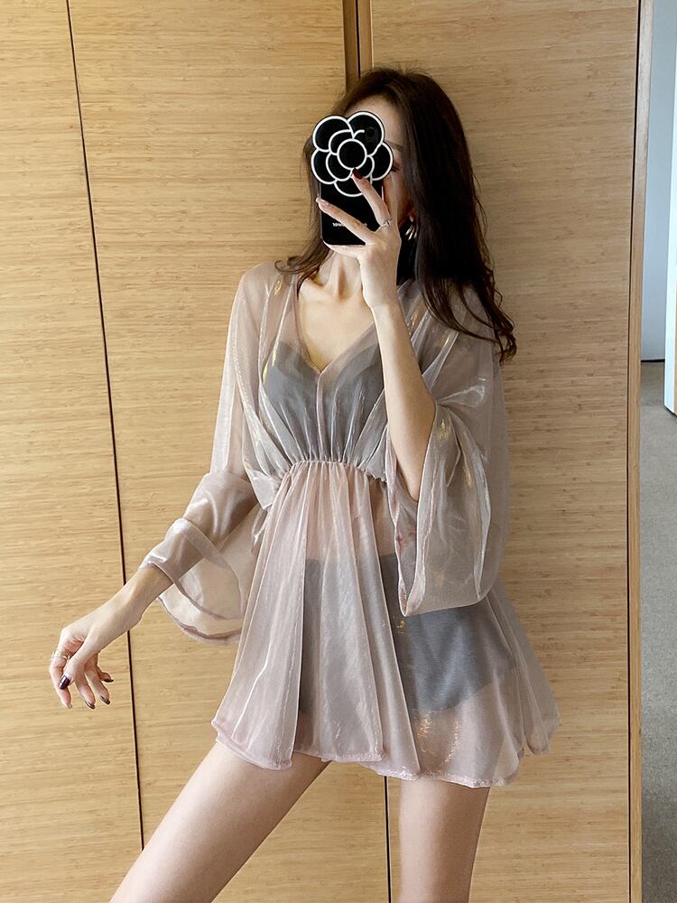 羽織がついた、とっても大人なビキニ水着。チュール素材で軽やか、透け感が大人の色っぽさを演出してくれます。長袖デザインで日焼け防止も◎。決して派手になり過ぎず、大人の女性らしいカラー展開も魅力的。
