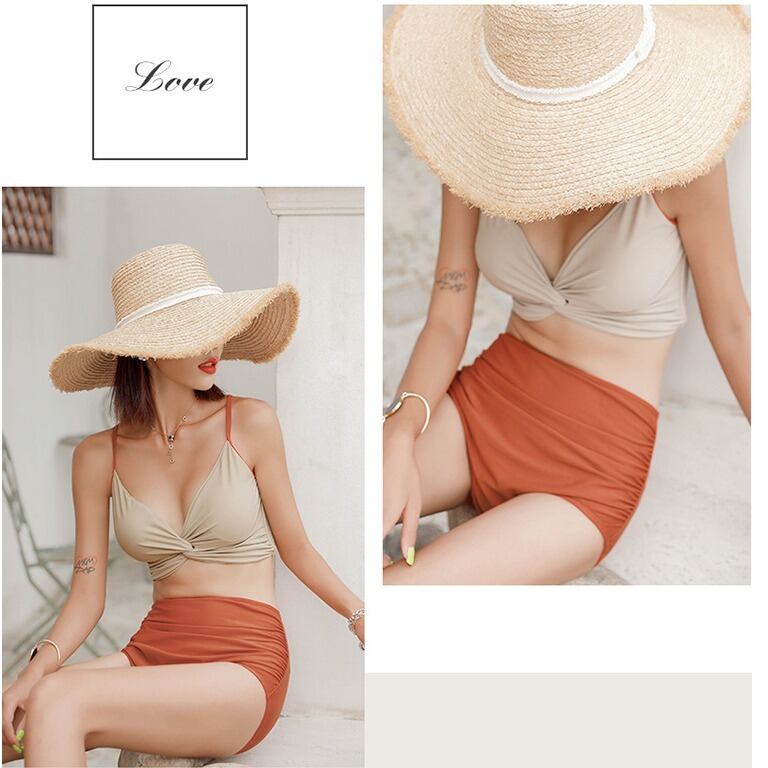 クロスバンドの胸元が美しいバストラインを作り上げてくれる、バイカラーデザインのビキニ。こっくりとした上品なベイクドカラーに、爽やかな印象のブルーが映える3色展開。ボックスタイプのショーツのフロントはギャザー仕様になっているから、気になるお腹を程よくカバー。背中のVラインに伸びるストラップに、チューブトップのようなトップスデザインがカジュアルな雰囲気に。