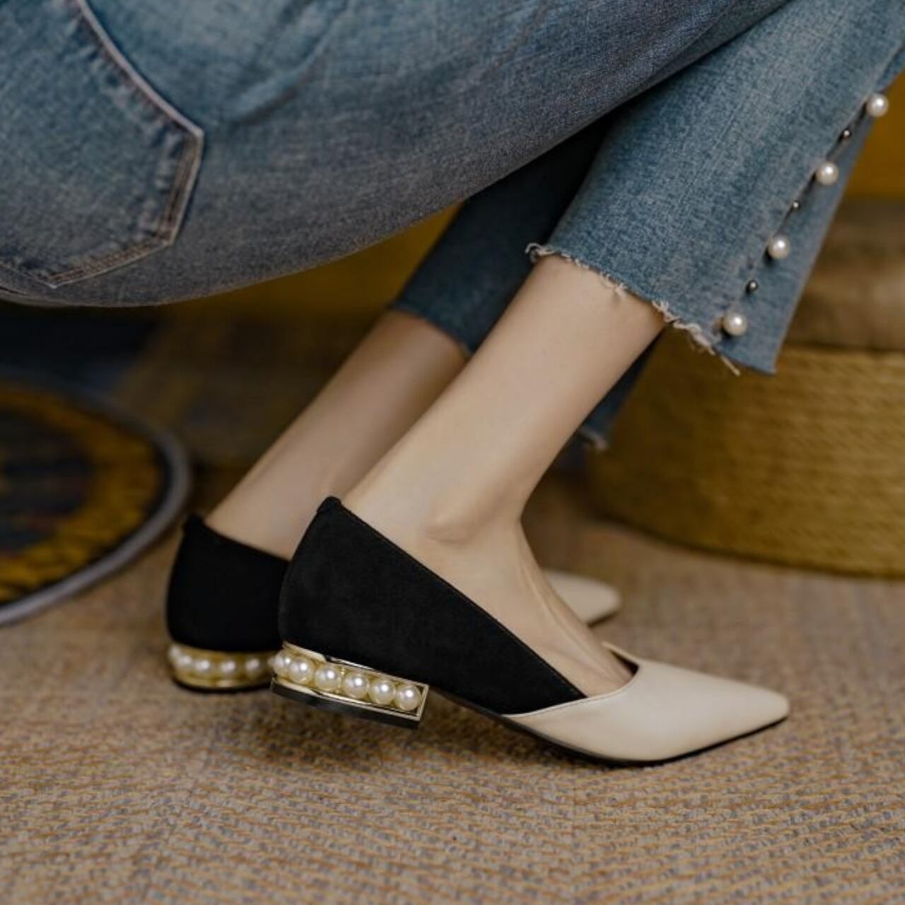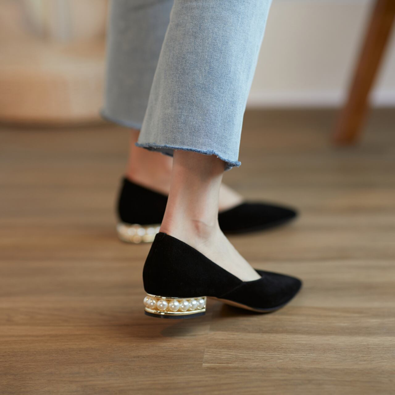 ポインテッドトゥとパールヒールが、大人可愛い上品な印象を与え、パールが足元を華やかに演出します。