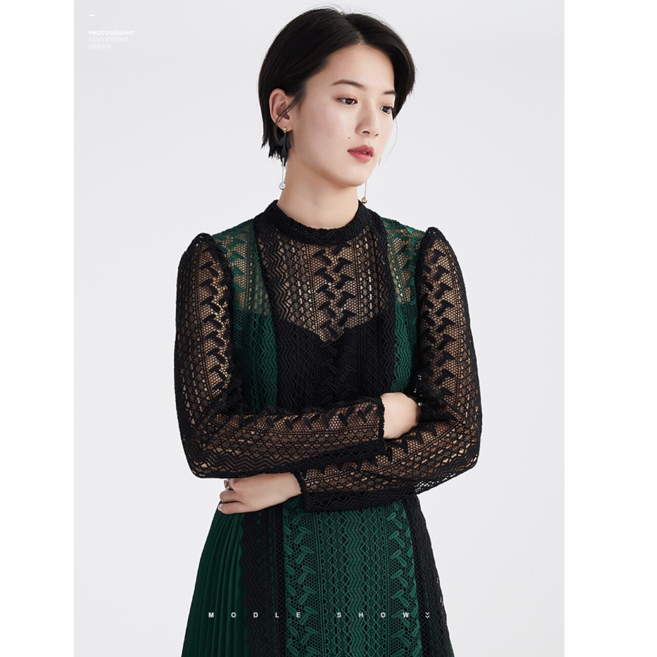 編み込まれたレースが透け感を演出し、フレアの広がりが女性らしさを強調します。