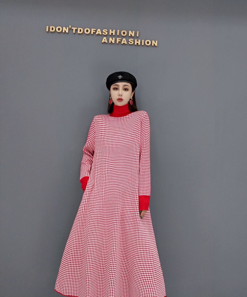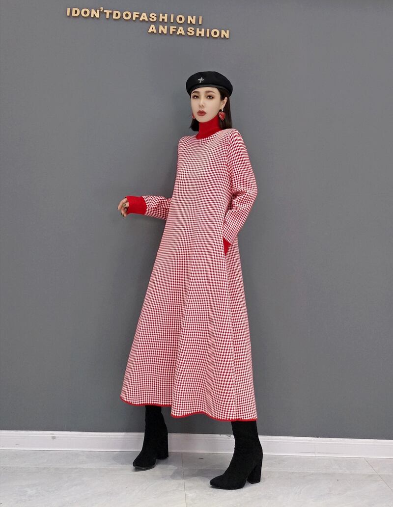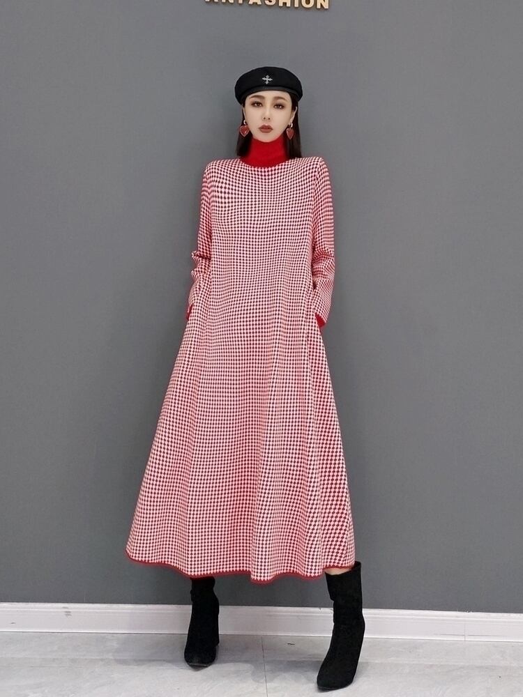 ブロックチェック ワンピース ロング丈 長袖 タートルネック Aライン 大人可愛い かっこいい 大人可愛い 大人女子 こなれ感 個性的 モード系 主役級 存在感 ブロックチェック 秋 冬 レディース デート お出かけ 休日 普段使い 韓国系 ファッション コーデ スタイル 楽ちん 暖かい 体型カバー S M L ゆったり 黒 赤 レッド