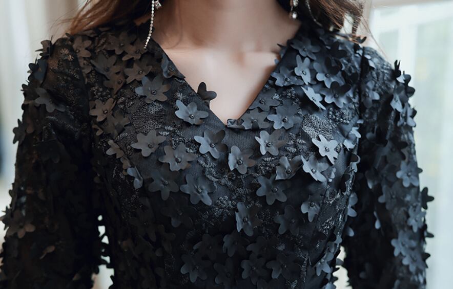 華やかで立体的な花が施された、大人可愛いブラックドレス。