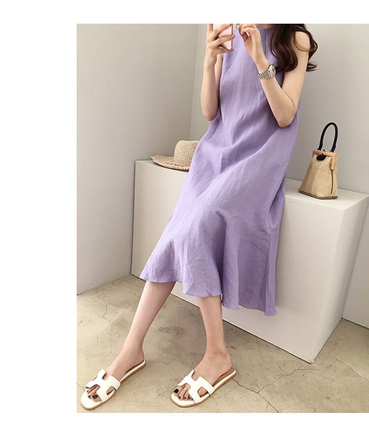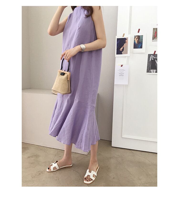このノースリーブワンピースは、コットンリネン素材を使用した柔らかな着心地が特徴! 爽やかなパープル色は、どんなシーンでも存在感を放ちます。
