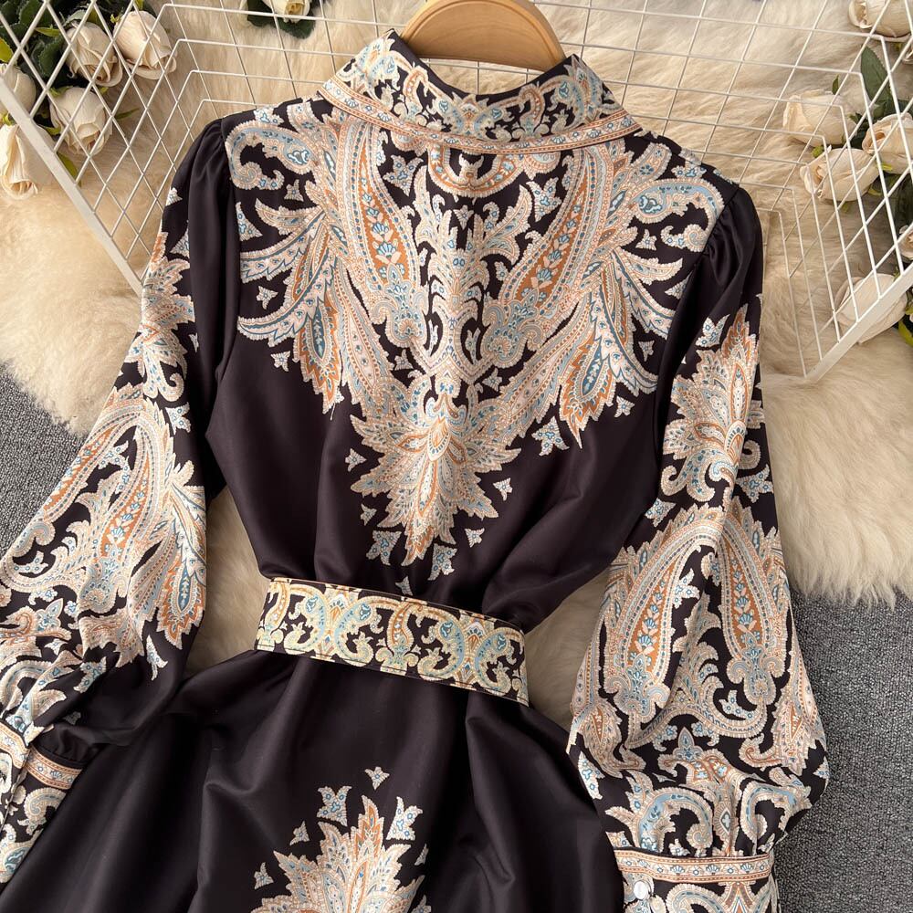 スカート ワンピース デート ロングスカート フレアスカート ワンピドレス ミモレ ミモレ丈 ロング ロング丈 長袖 ボリューム袖 襟付き セミフレア Aライン ベルト ウエストマーク サテン かわいい 大人可愛い きれいめ 大人 上品 おしゃれ お洒落エキゾチック 大人可愛い 大人女子 ラフ ラブリー キュート セクシー エレガント ペイズリー オールシーズン 誕生日 結婚式 二次会 20代 30代 40代 50代 60代 レディース 女性用 ママ デート お出かけ 女子会 パーティー