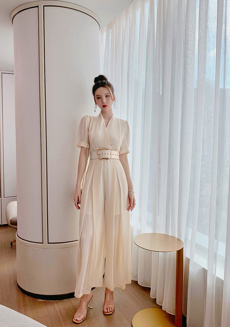 パンツドレスでシックでクールなパーティースタイルに!フレアパンツとハイウエストのベルトがスラっとした印象にしてくれます。