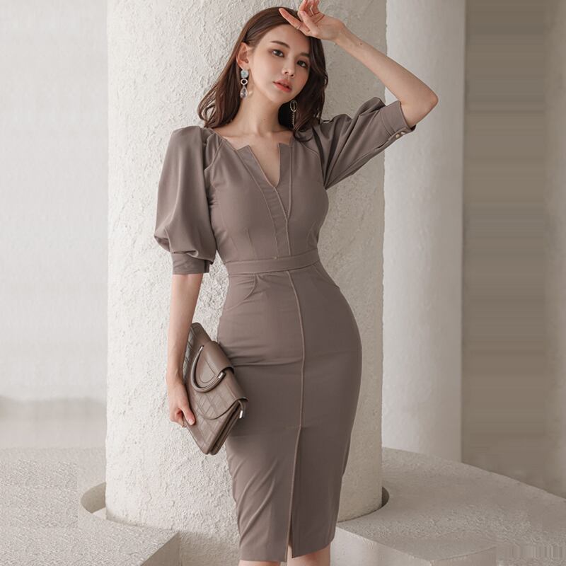 ワンピース セットアップ 膝丈 ひざ丈 袖あり 5分袖 五分袖 長袖 ボリューム袖 Vネック タイト ワンピ 膝下 細身 脚長 美脚 フロントスリット ウエストマーク スリット オフィスカジュアル 大人可愛い きれいめ カジュアル 上品 おしゃれ お洒落 かっこいい 大人カジュアル 大人女子 こなれ感 クール モード系 セクシー エレガント デート コーデ モテ 無地 春 夏 秋 冬 オールシーズン 20代 30代 40代 レディース ビジネス パーティー ファッション スタイル S M L XL カーキ