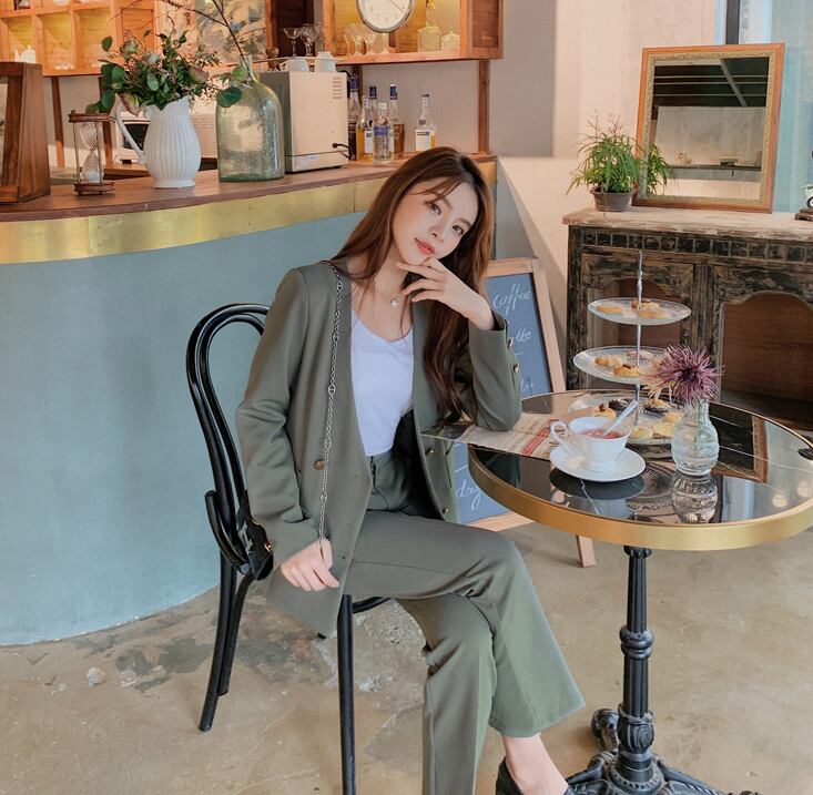 春にぴったりなカジュアルスーツセットアップの登場です。2点セットなので、トップスとボトムスの相性もばっちり。上品なVネックと襟付きのデザインが、大人の女性にぴったりな印象を与えます。