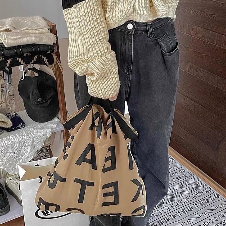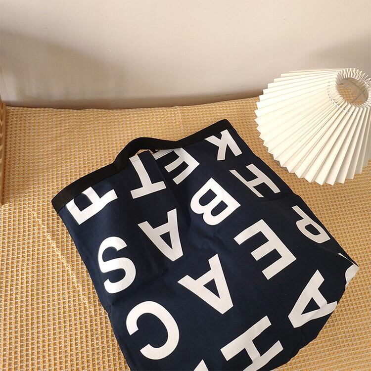 トートバッグの表面には、アルファベットプリントが施されており、おしゃれでスタイリッシュな印象を与えます。