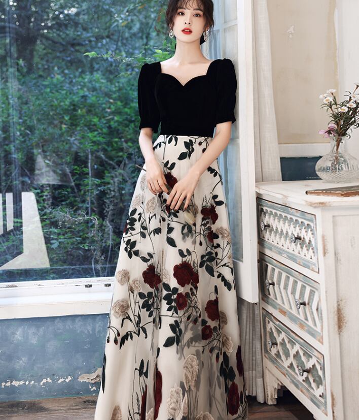 クラシカルなシルエットのロングワンピース刺繍入りのチュールがフェアリーな印象のフレアなデザイン。バラの美しさ際立つ一着