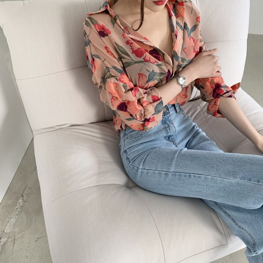 水彩で描かれたような大胆な花柄が視線を惹き付け印象付ける、上品さをプラスしたカジュアルライクなフラワー柄長袖シャツ。シフォンのように柔らかく、透け感のあるデザインが軽やかで涼し気な印象に。