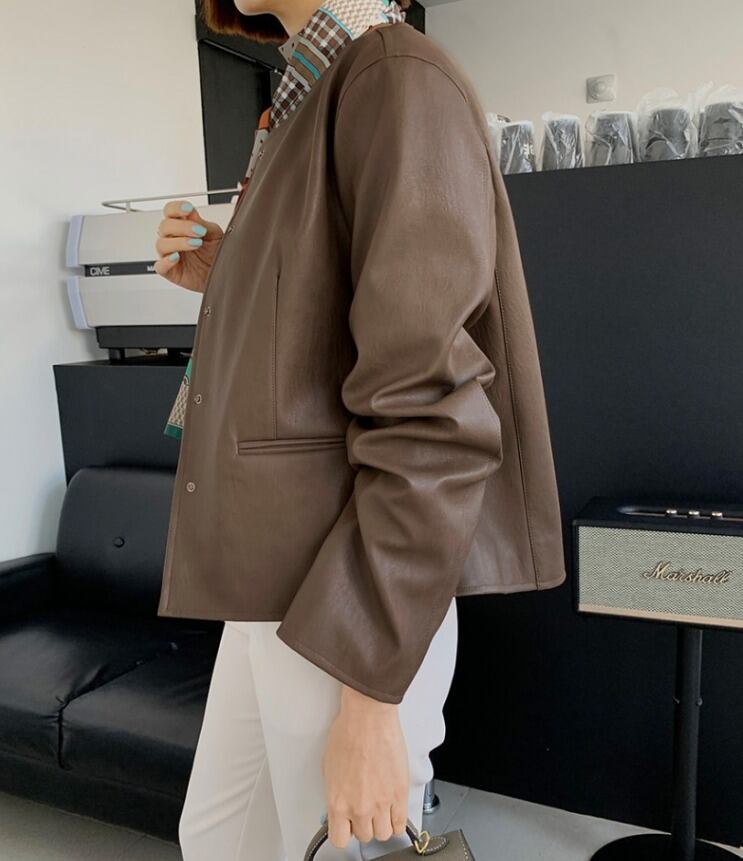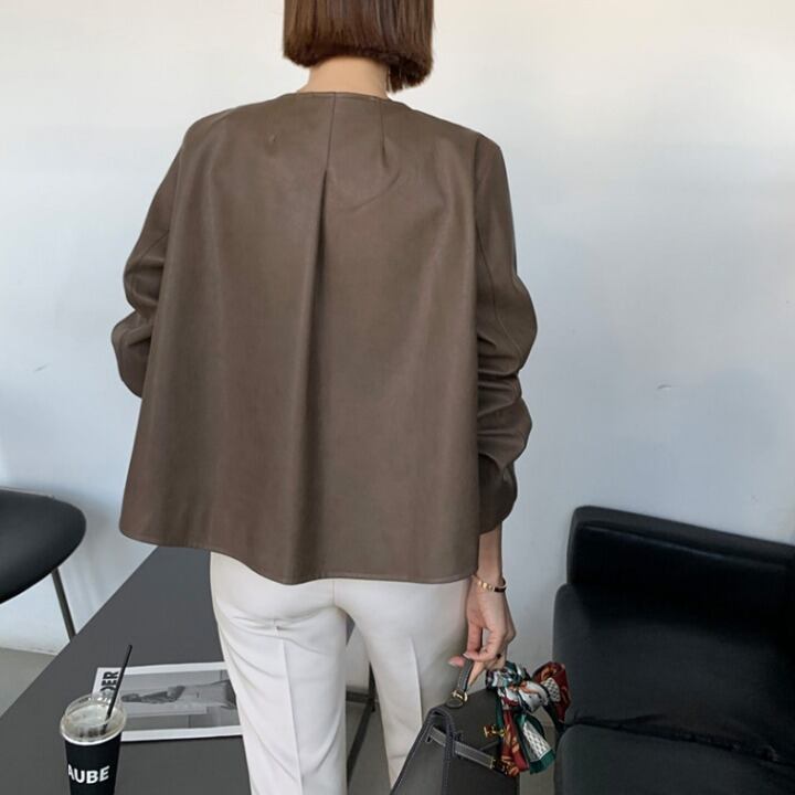 ジャケット 上着 羽織り 袖あり 長袖 ラウンドネック 襟なし ノーカラー フェイクレザー きれいめ シンプル カジュアル 大人 おしゃれ お洒落 かっこいい レトロ こなれ感 ラフ メンズライク ユニセックス 都会的 クール シック ラグジュアリー 無地 秋 10代 20代 30代 40代 50代 60代 レディース ママ オフィス ビジネス OL 通勤 学生 デート お出かけ 休日 パーティー 旅行 レストラン ショッピング 合コン カフェ 着回し 普段使い レイヤード ホワイト ブラック ブラウン