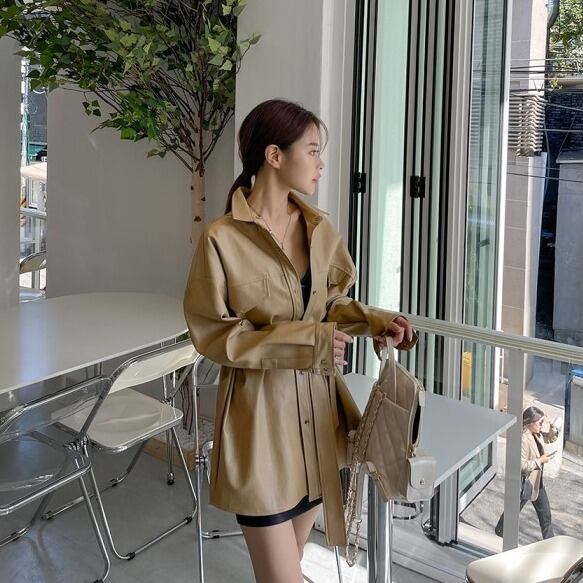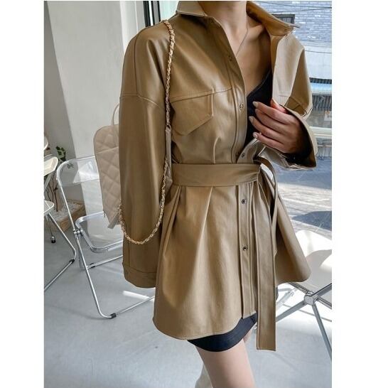 ジャケット 上着 羽織り ミディアム丈 ミドル丈 袖あり 長袖 襟付き ベルト ウエストリボン 前開き コンサバ フェイクレザー PU きれいめ シンプル 大人 上品 おしゃれ レトロ ラフ メンズライク ユニセックス 都会的 クール シック ラグジュアリー ベーシック 無地 秋 20代 30代 40代 50代 60代 レディース 女性用 男女兼用 ビジネス OL 通勤 デート お出かけ 休日 パーティー イベント 旅行 ショッピング 合コン 着回し 楽ちん 体型カバー フリーサイズ ブラック ベージュ