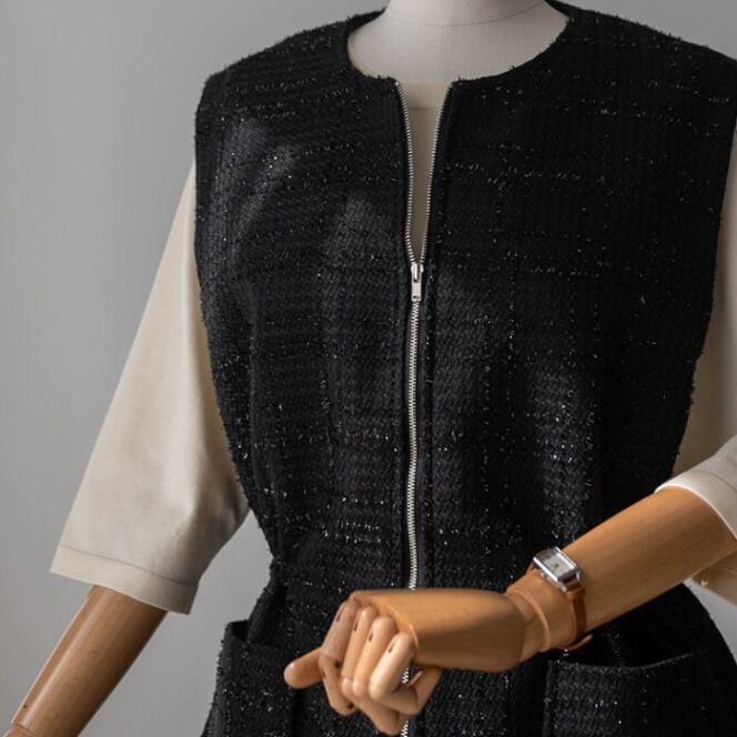 程よいラメ感を感じられる大人カジュアルなシンプルZIPベスト。チェックにジャガードされたファブリックや両サイドの大きめなスクエアポケット、ウェストラインのドロストなど、こなれ感が漂うシルエットに。