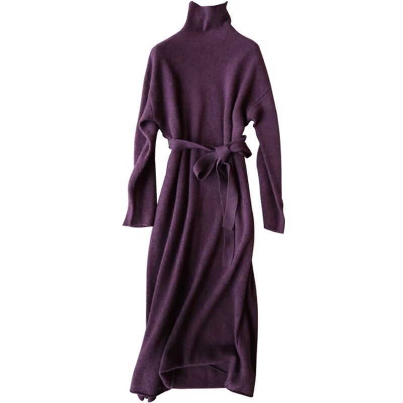 ワンピース ニットスカート ロング丈 長袖 タートルネック セミフレア ウエストリボン ニット きれいめ シンプル 上品 エレガント 秋 冬 デート 女子会 S M L XL 2XL レッド ブルー グリーン パープル