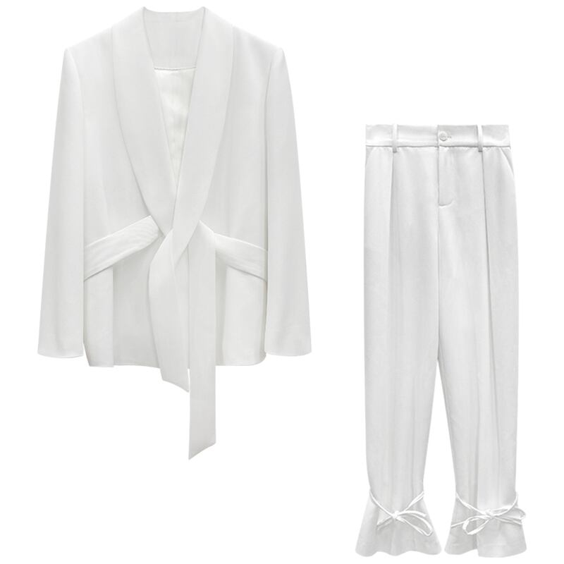 スーツ パンツスーツ ジャケット セットアップ テーラード アンクル丈 9分丈 ミディアム丈 袖あり長袖 襟付き 無地 シンプル リボン ベルト 上下セット 2点セット レディース クール きれいめ 大人女子 かっこいい お洒落 おしゃれ モード系 シンプル ファッション スタイル 韓国 オルチャン 存在感 主役級 個性的 結婚式 二次会 披露宴 フォーマル レストラン イベント パーティー パーティ 20代 30代 40代 オールシーズン シーズンレス 春 夏 秋 冬 S M L XL 白 ホワイト