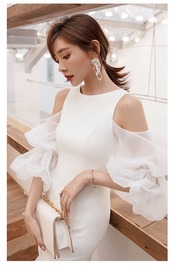 ドレス ワンピース パーティードレス ミモレ丈ドレス フォーマルドレス ミモレ ミモレ丈 パフスリーブ ラウンドネック オフショルダー オフショル シフォン サイドスリット きれいめ 上品 フォーマル エレガント きれいめ パーティー