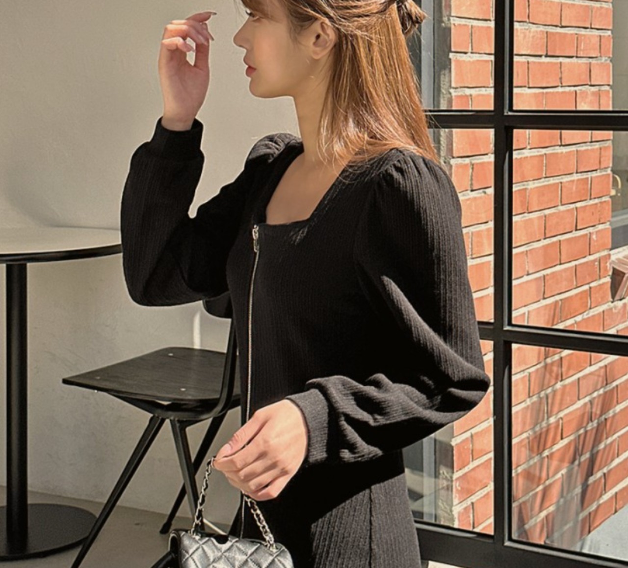 ロングワンピース リブ編み ジップアップ ワンピース ロングスカート タイトスカート ミモレ丈 ロング 長袖 パフスリーブ スクエアネック 襟なし タイト ファスナー リブ 前開き リブニット 伸縮性 ポリエステル ニット ナイロン 大人可愛い きれいめ シンプル カジュアル 大人 上品 おしゃれ 大人女子 キュート クール モード系 無地 秋 冬 20代 30代 レディース ママ デート お出かけ 女子会 休日 高原 ホテル ガーデン レストラン ショッピング モテ 黒 モノトーン