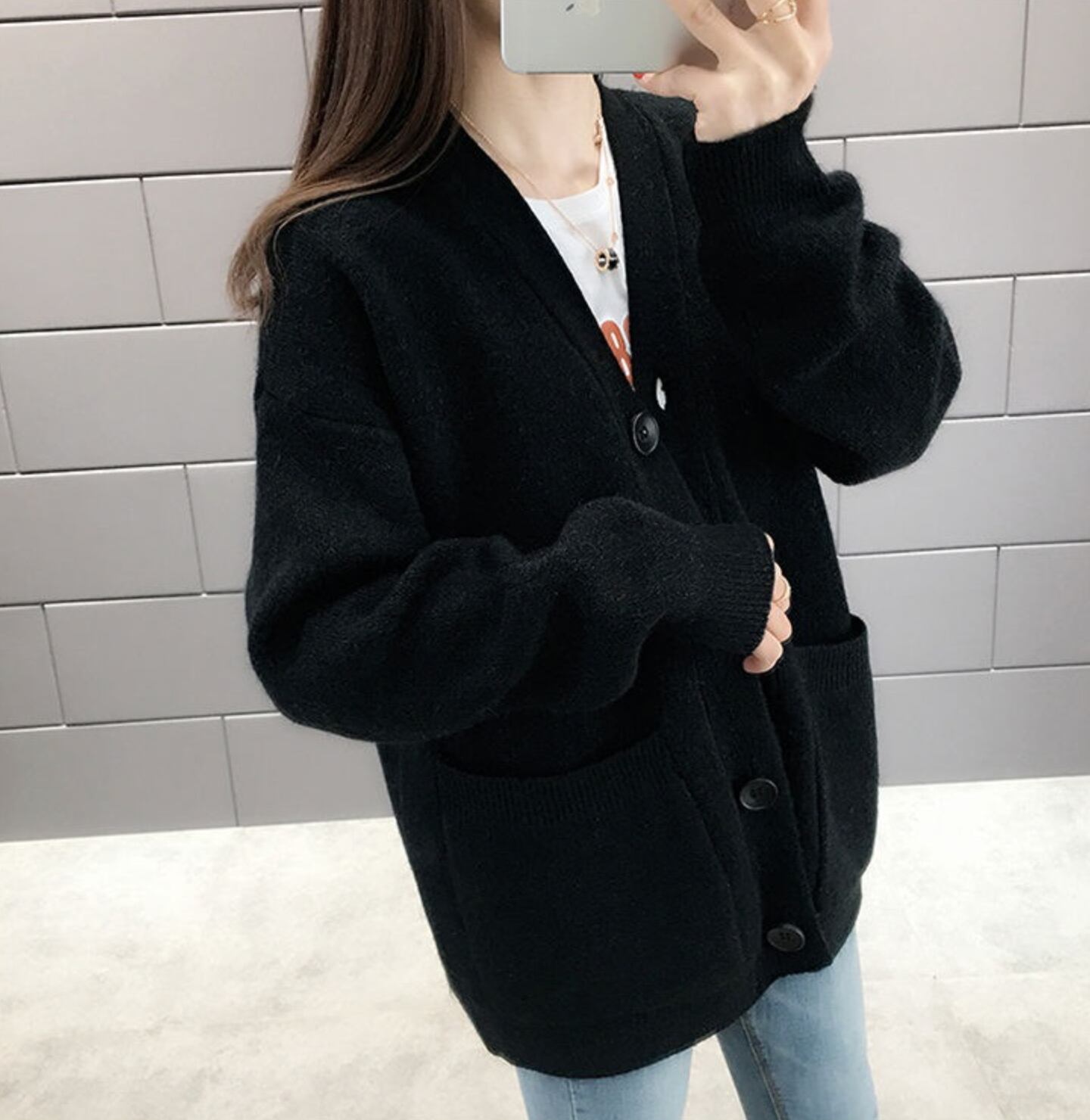 重ね着もしやすいゆったりシルエットのVネックカーディガン。