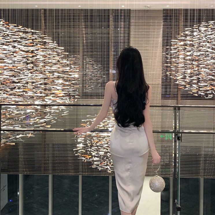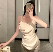 胸元のドレープデザインでバストアップにキュッと締まったウエストのシャンパンドレス。光沢のある生地感は煌びやかな夜を演出。スリットの入ったスカートが大人なシルエットに。