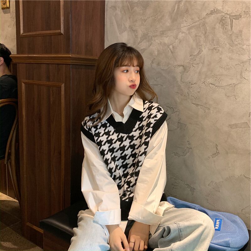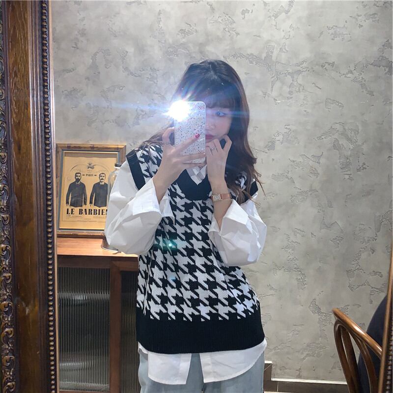 トップス ベスト 袖なし Vネック ニット かわいい カジュアル ラフ ラブリー ガーリー 千鳥格子 学生 通学 ペア 男女兼用 デート お出かけ 着回し 普段使い 楽ちん S M L 黒 ブルー