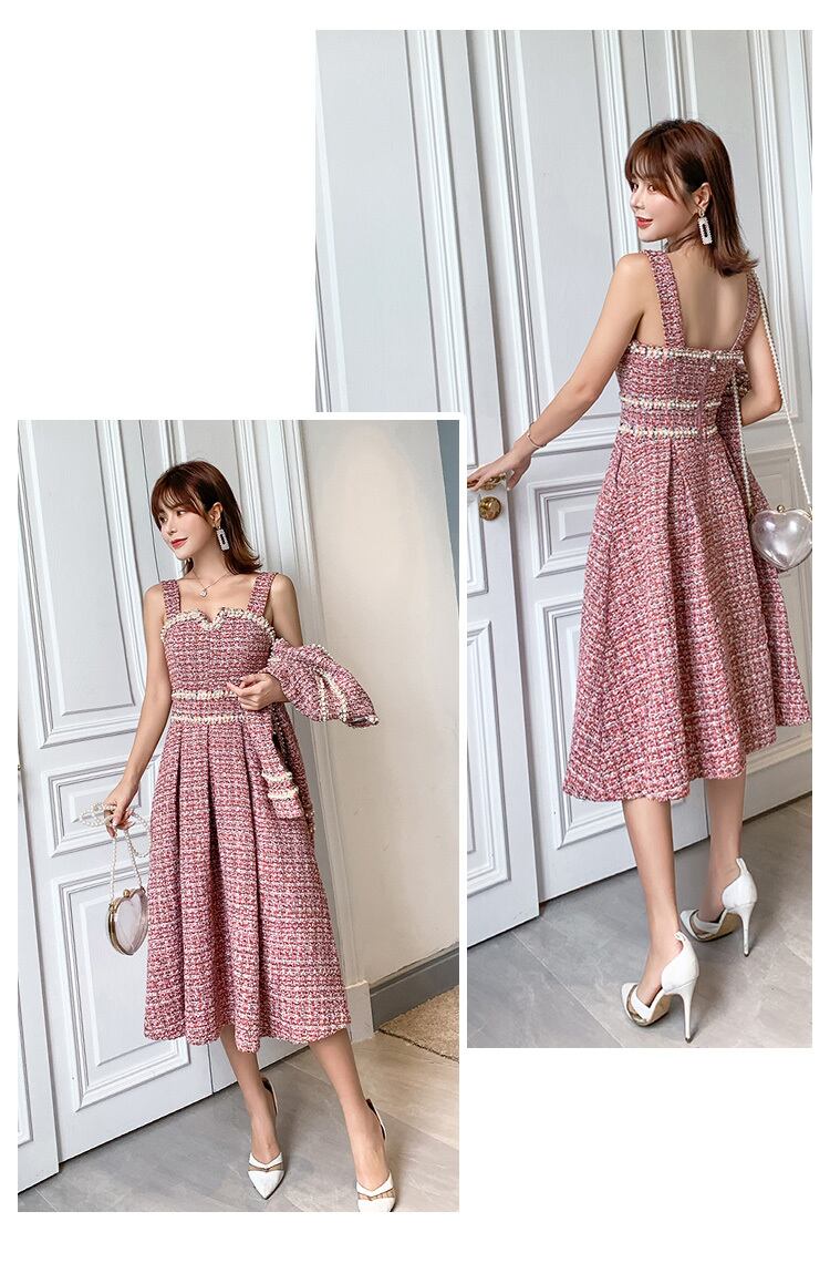 ワンピース セットアップ ジャケット 上着 スーツ ツイードツーピースワンピース 膝下 ミモレ丈 フレア Aライン ウエストマーク 2点セット オールシーズン 誕生日 結婚式 二次会 披露宴 デート お出かけ パーティー イベント モテ 体系カバー S M L XL ピンク