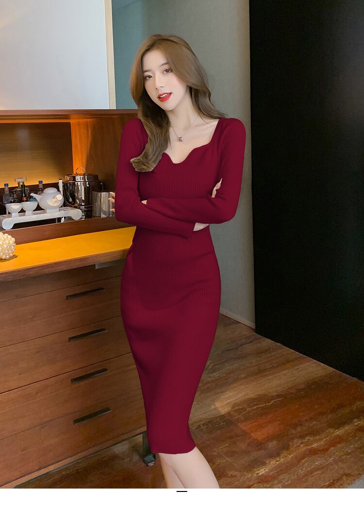 タイトなリブ編みニットワンピースが美脚に見せてくれる!細身シルエットとVネックが女性らしい印象を与えます。