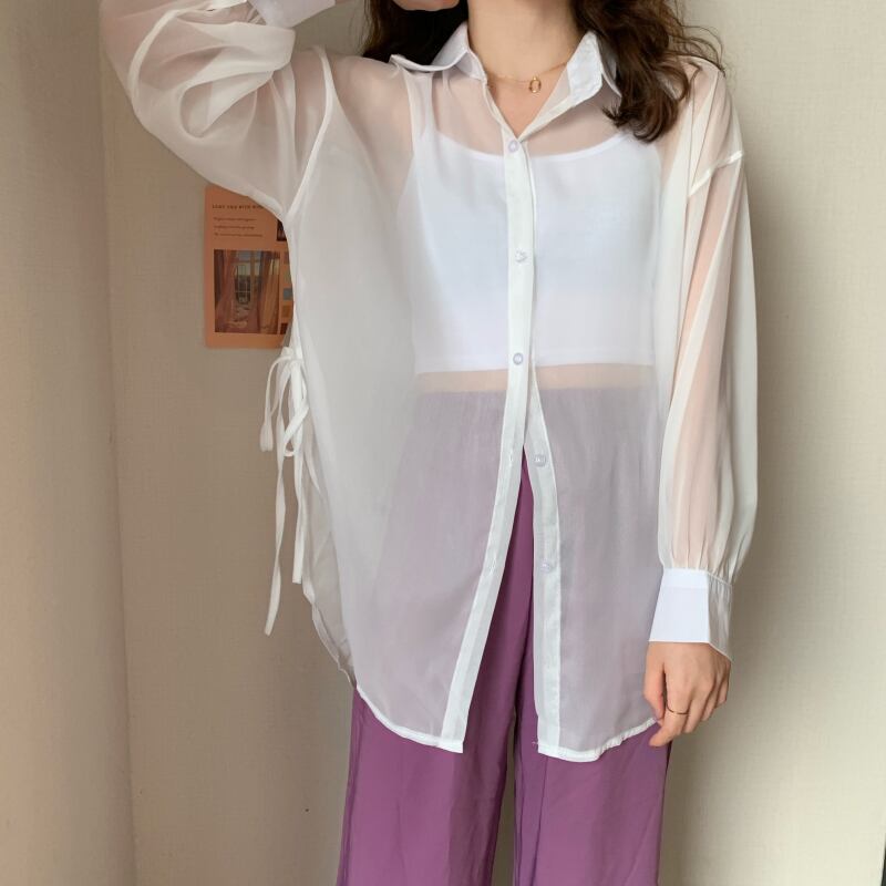 トップス シャツ レギュラー丈 レギュラー 袖あり 長袖 襟付き 角襟 ポロカラー リボン 透け感 シースルー ボタン 薄手 UVカット かわいい 大人可愛い 大人 上品 おしゃれ お洒落 かっこいい 大人女子 こなれ感 ラフ ラブリー キュート ガーリー ルーズ 個性的 主役級 とろみ感 抜け感 無地 春 夏 10代 20代 通勤 学生 通学 デート お出かけ 女子会 休日 イベント リゾート 旅行 ホテル ガーデン レストラン ショッピング モテ ゆったり