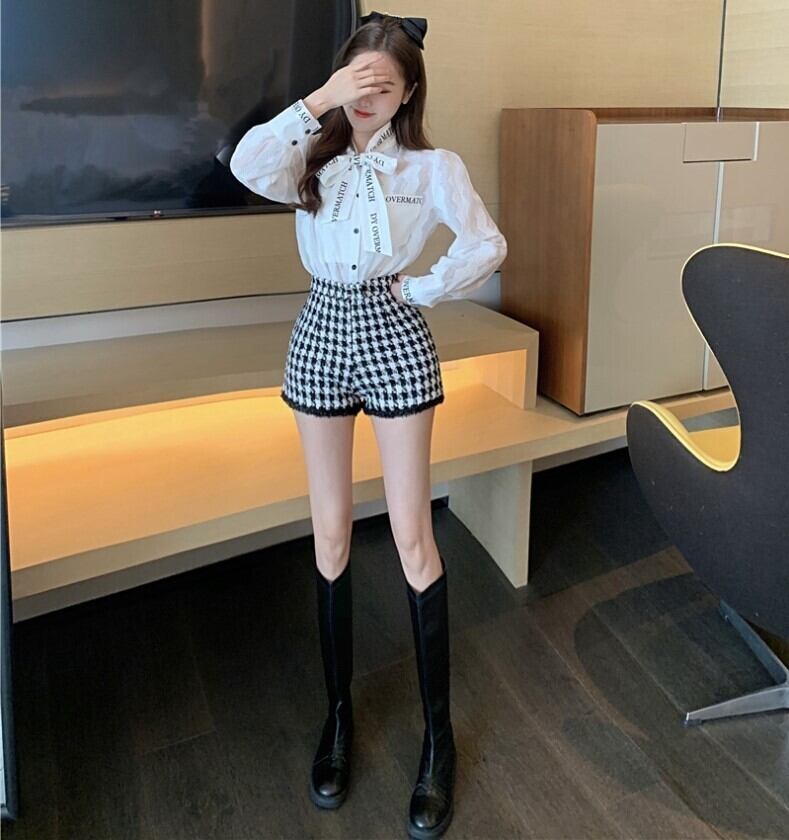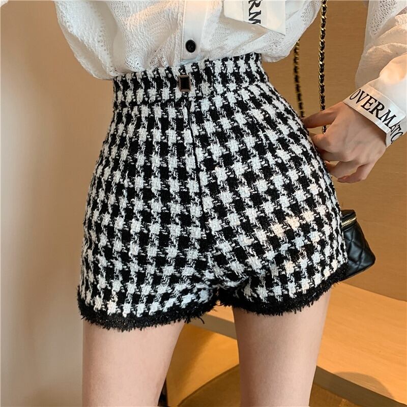 千鳥格子でシックなショートパンツは、ハイウエストで脚長効果に◎