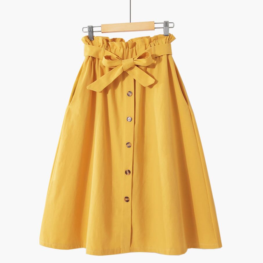 スカート フレアスカート 膝下 ミモレ フレア Aライン リボン ウエストリボン ハイウエスト ウエストゴム 裏地なし フロントボタン かわいい 大人可愛い シンプル カジュアル 上品 ラフ キュート ガーリー ナチュラル 着心地 フェミニン 無地 オールシーズン レディース ママ OL 通勤 学生 通学 デート お出かけ 公園 着回し 普段使い 楽ちん 体型カバー 脚長 リラックス 毎日 ベルトアレンジ フリーサイズ ゆったり 白 黒 赤 ベージュ カーキ ピンク 水色 マスタード アプリコット