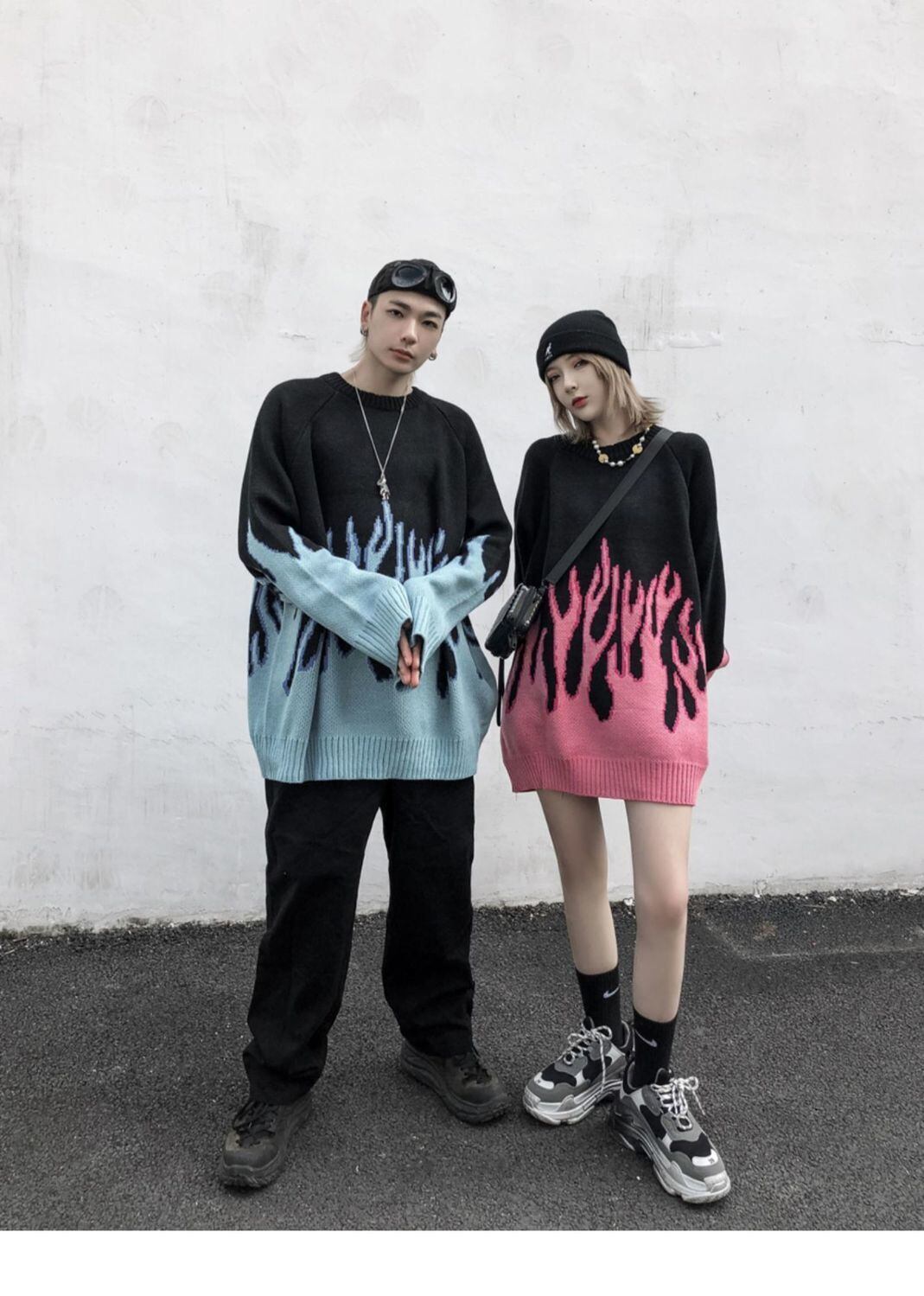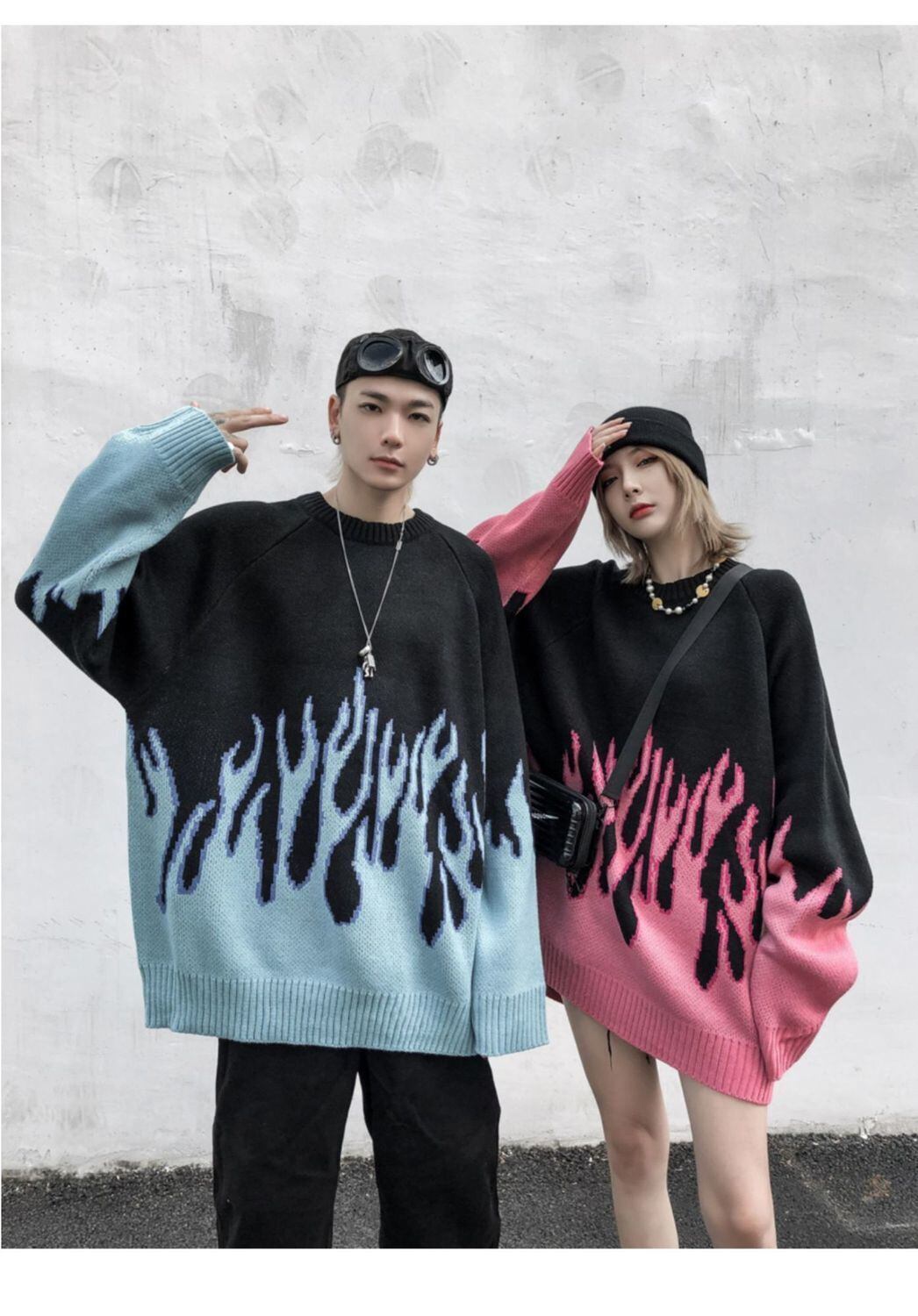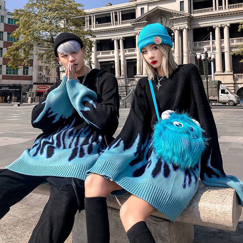 トップス セーター ラウンドネック おしゃれ かっこいい ラフ メンズライク マニッシュ ボーイッシュ 個性的 クール ファイヤー 秋 冬 レディース メンズ ペア 女性用 男性用 男女兼用 学生 デート お出かけ 休日 ショッピング 着回し 普段使い お揃い 双子 楽ちん