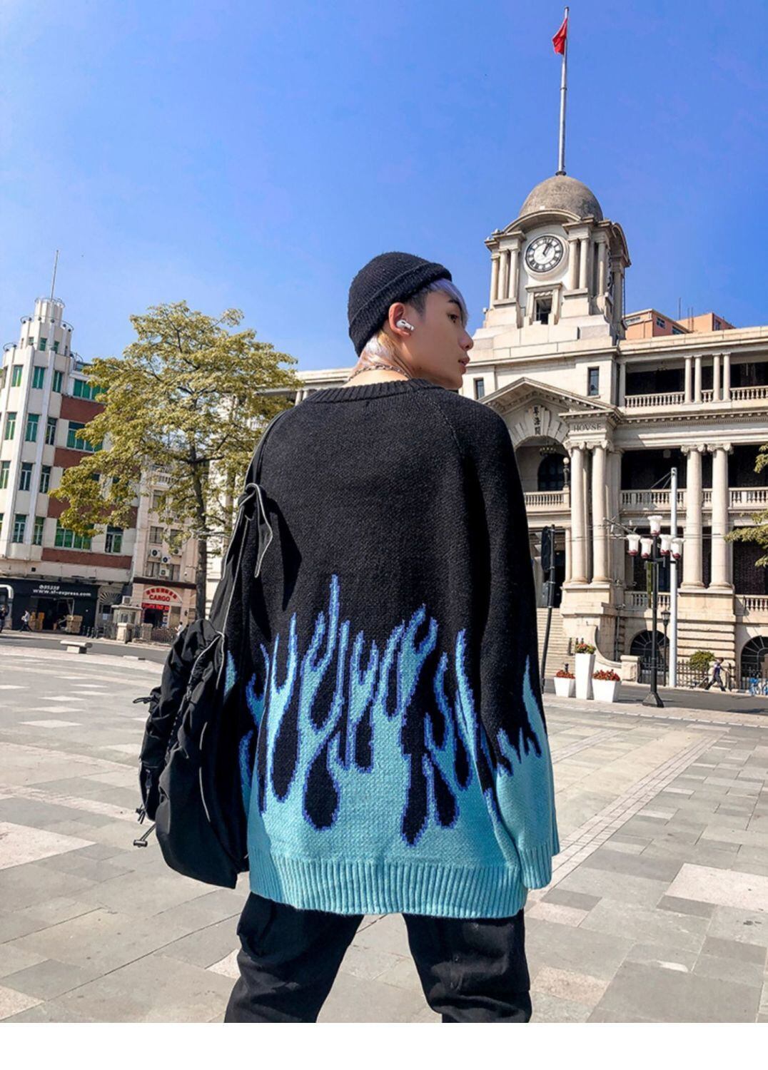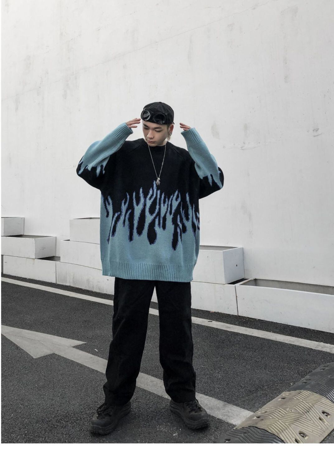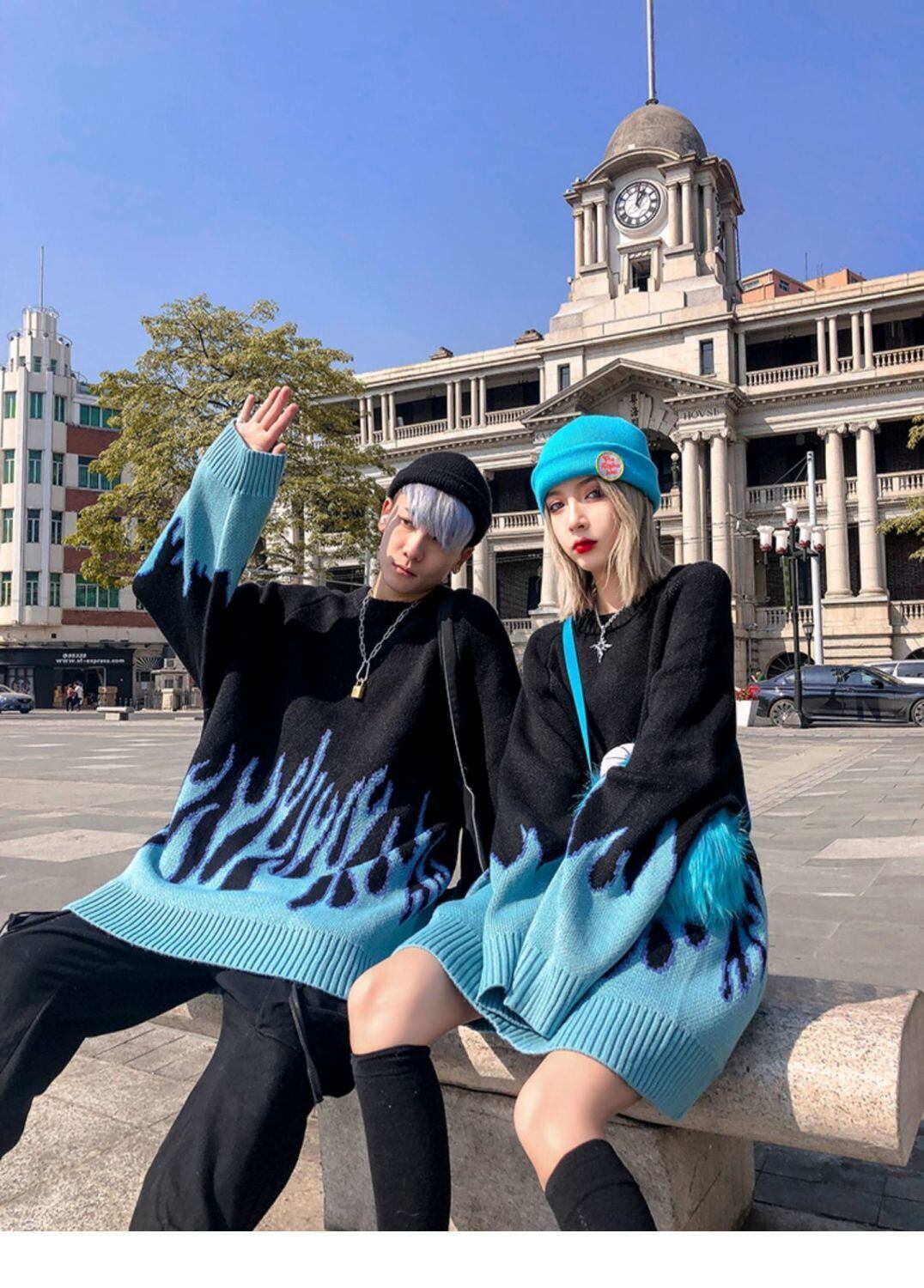 トップス セーター ラウンドネック おしゃれ かっこいい ラフ メンズライク マニッシュ ボーイッシュ 個性的 クール ファイヤー 秋 冬 レディース メンズ ペア 女性用 男性用 男女兼用 学生 デート お出かけ 休日 ショッピング 着回し 普段使い お揃い 双子 楽ちん