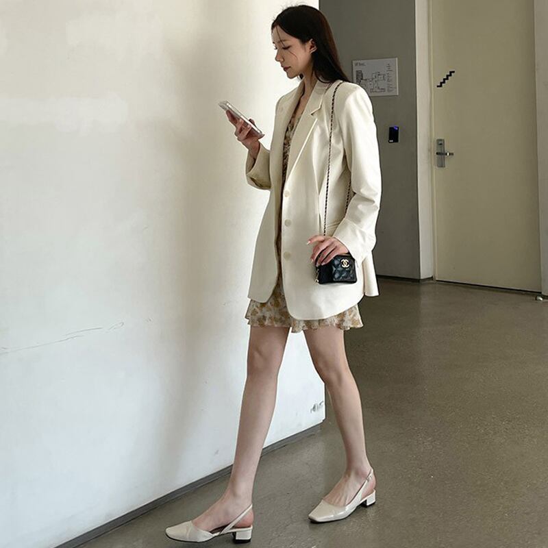 程よい艶感を感じられるフォーマルライクなスーツジャケット。長めの丈がカジュアル感をプラスしてくれます。上品さ漂うホワイトカラーが美しく、清楚な印象に。