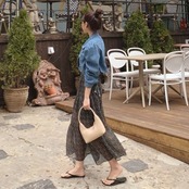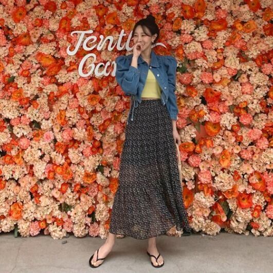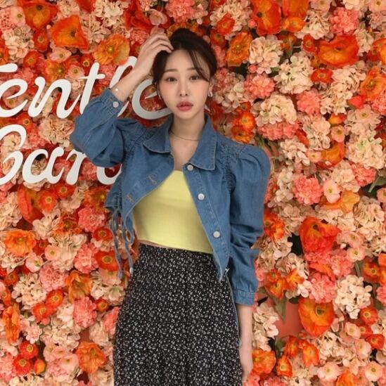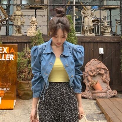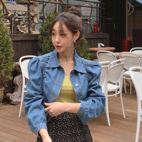 シンプルなデニム地のジャケットは、両サイドのドロスト紐を絞れば、変形シルエットに早変わりするユニークなジャケット。ふっくらしたパフスリーブが可愛らしい女性らしさをプラスしてくれます。