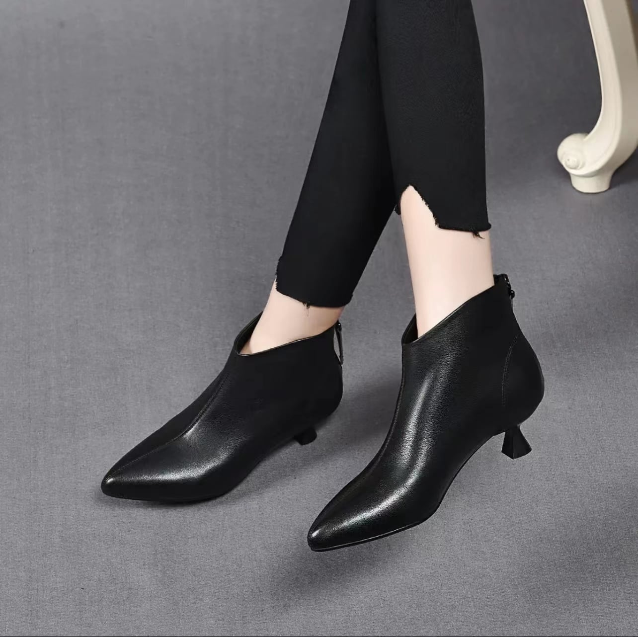 シンプルながらもエレガントな印象を与えるピンヒールブーティです。