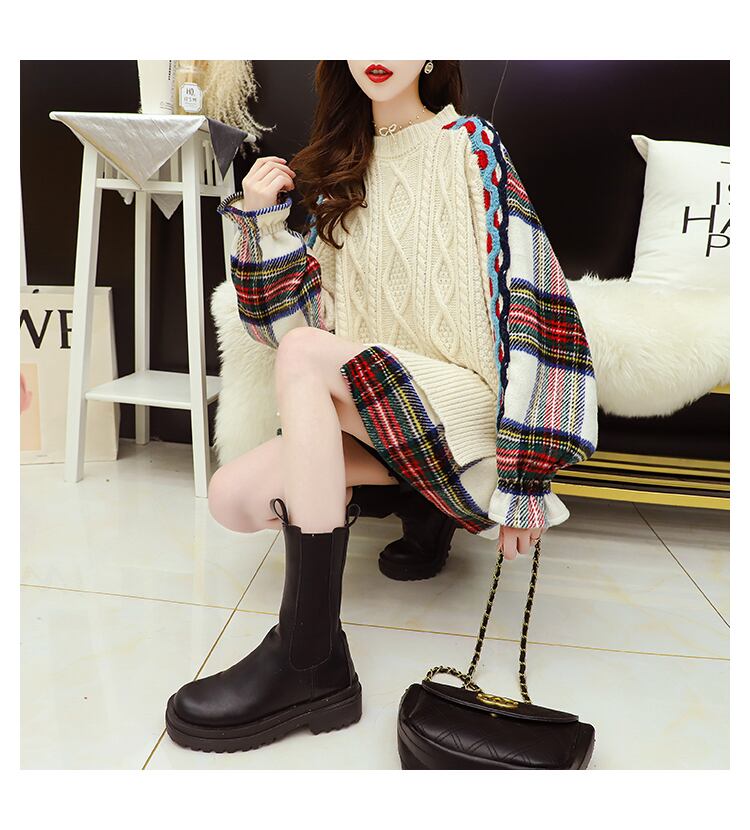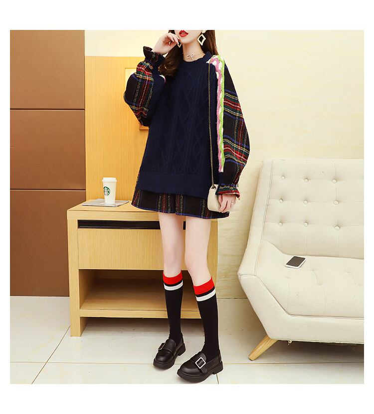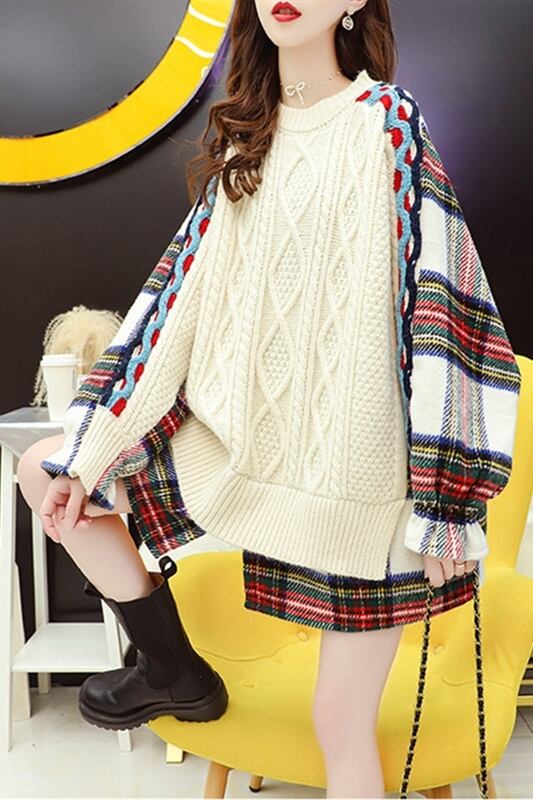 トップス セーター プルオーバー 袖あり 長袖 ラウンドネック 襟なし 切り替えデザイン ドッキング ケーブルニット ニット かわいい おしゃれ お洒落 レトロ ラフ ラブリー キュート ガーリー 個性的 チェック柄 冬 通勤 学生 通学 女子会 お泊り 休日 普段使い デート 公園デビュー レストラン 高原 旅行 ファッション コーデ 暖かい 普段使い モテ 体系カバー レディース 10代 20代 30代 40代 S M L XL ゆったり ゆる ホワイト ネイビー