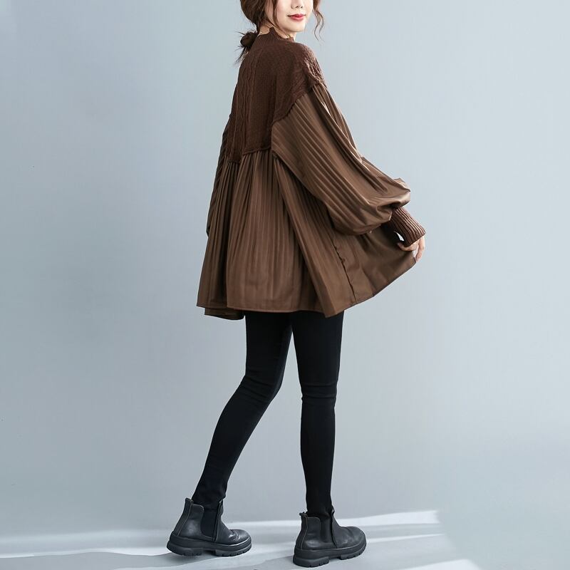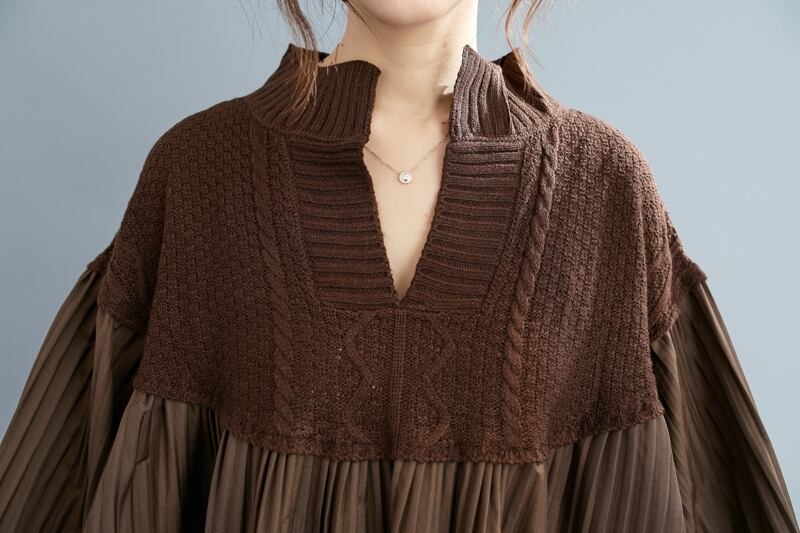 トップス プルオーバー チュニック ニット プリーツスカート 袖あり 長袖 ランタンスリーブ Vネック ゆったり プリーツ 異素材MIX かわいい 大人可愛い 大人 おしゃれ お洒落 大人女子 こなれ感 キュート ガーリー 個性的 無地 10代 20代 30代 通勤 学生 通学 デート お出かけ 女子会 休日 イベント 旅行 ホテル ガーデン レストラン ショッピング 韓国 韓国系 オルチャン ファッション フリーサイズ ブラック ブラウン