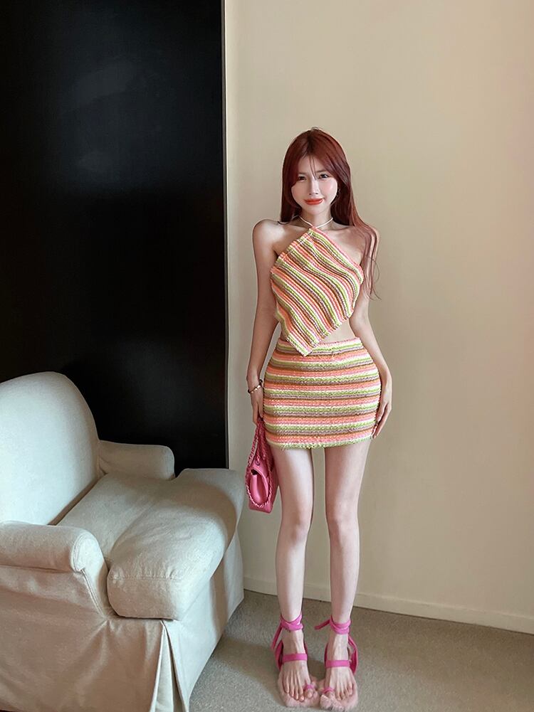 彩色 トップス スカート セットアップ ニットソー ミニスカート ツーピーストップス ミニ ミニ丈 ショート ショート丈 膝上 袖なし ノースリーブ ホルターネック タイト 細身 クロシェ ポリエステル サマーニット 上下セット 2点セット ツーピース かわいい 大人可愛い エキゾチック キュート セクシー ボーダー シマ 夏 20代 30代 レディース お出かけ リゾート 旅行 海 美脚 脚長 S M L 緑 グリーン 茶色 ブラウン 黄色 イエロー ピンク オレンジ