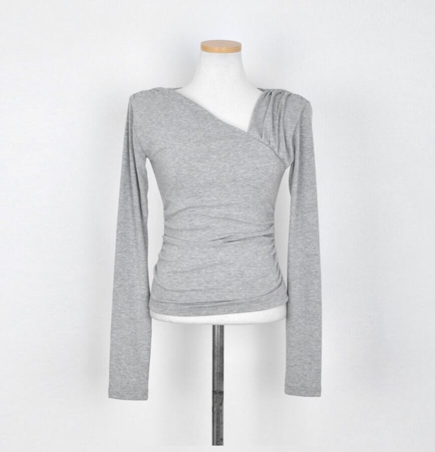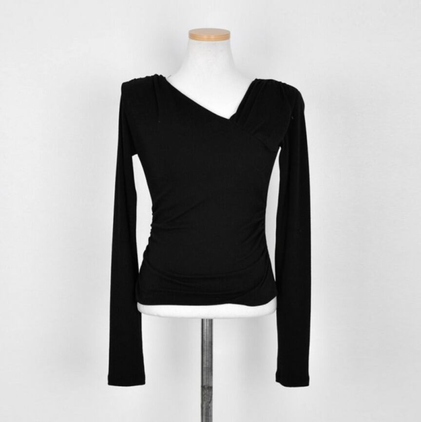 アシンメトリーデザインがお洒落なシンプルトップスです。タイトなシルエットでスタイルをよく見せてくれる女性に嬉しい一着。無地なので着回しやすく、色々なコーデに取り込める優れものです。