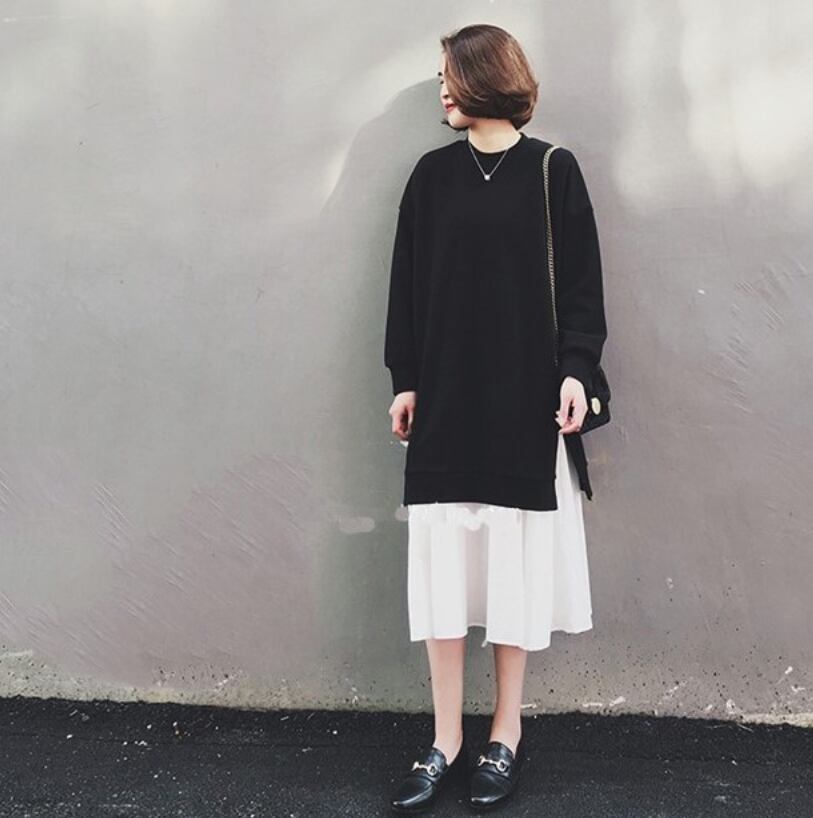 スウェットとシャツスカートのドッキングが大人可愛く、存在感放つワンピース。