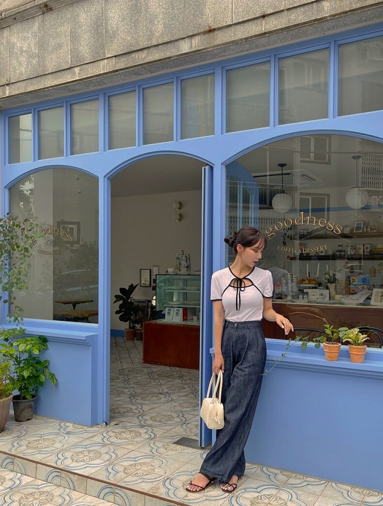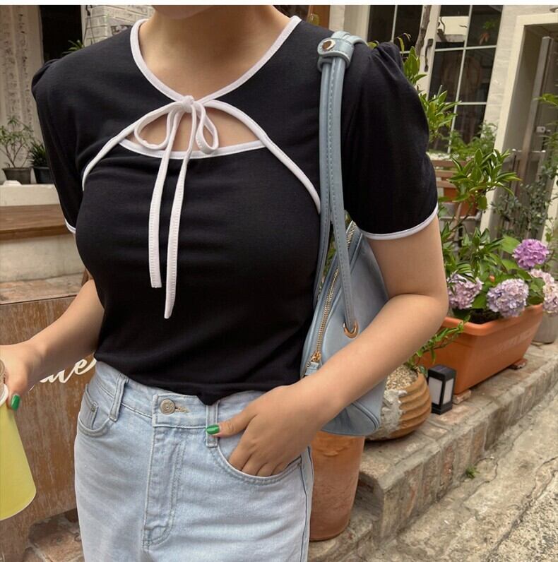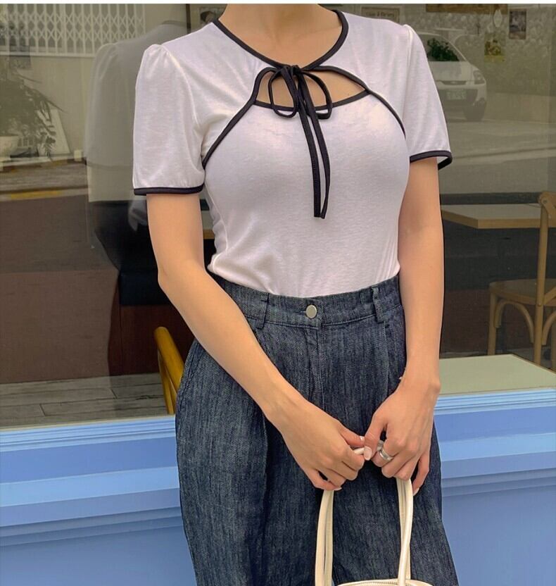 トップス Tシャツ カットソー 半袖 リボン かわいい シンプル カジュアル 上品 ラブリー キュート ガーリー 春 夏 学生 通学 デート お出かけ 女子会 海 プール ショッピング 着回し 普段使い S M L XL ホワイト 黒 水色
