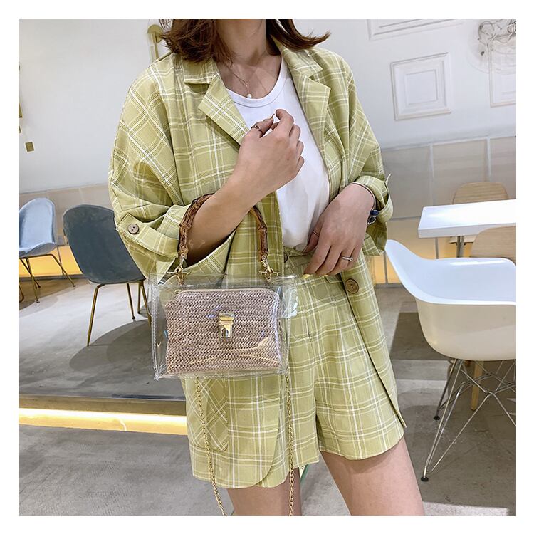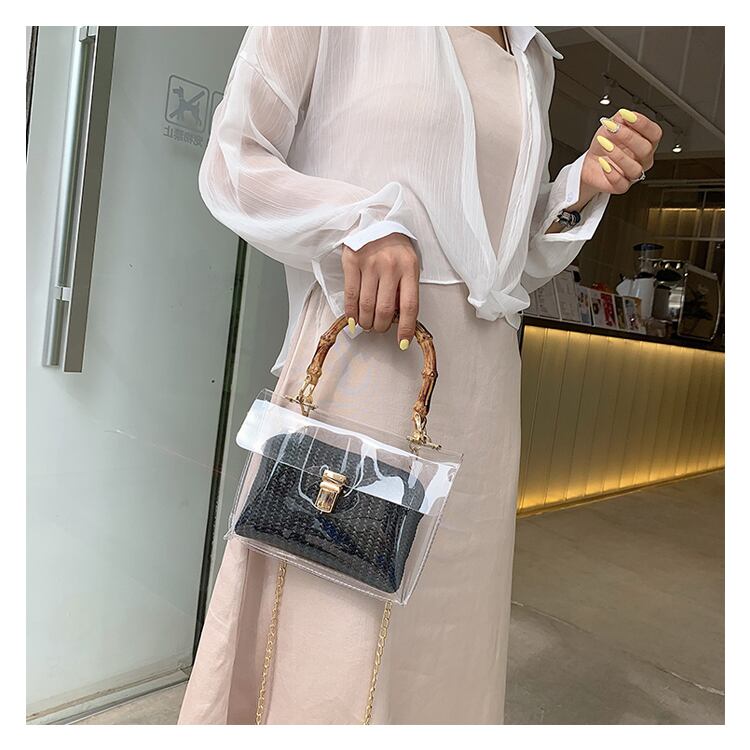 バンブーハンドルがおしゃれで、トレンド感あふれるクリアバッグです。
