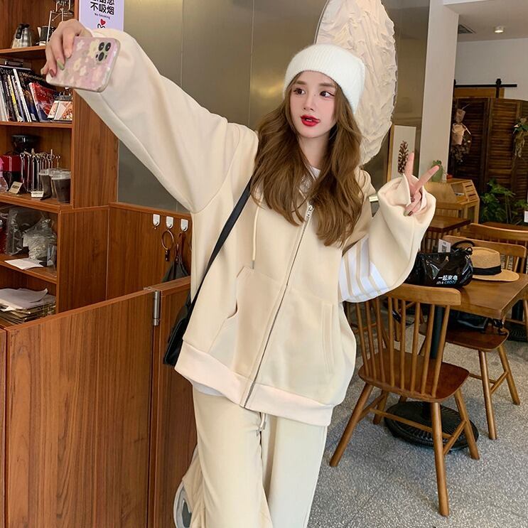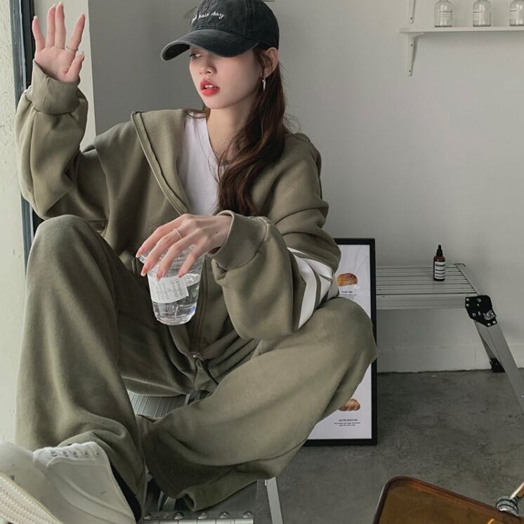 セットアップ トップス ボトムス パンツ ルームウェア パーカー 上着 羽織り スウェット ジャージ 部屋着 スポーツウェア ロングパンツ ロング ロング丈 袖あり 長袖 襟なし フード ストレート ワイド バイカラー 配色 フード付き ファスナー ポケット 前開き 上下セット 2点セット ツーピース セット カジュアル おしゃれ かっこいい レトロ こなれ感 ラフ メンズライク ボーイッシュ ユニセックス ルーズ 抜け感 無地 春 秋 冬 運動 スポーツ ジム ダンス アウトドア クリーム カーキ