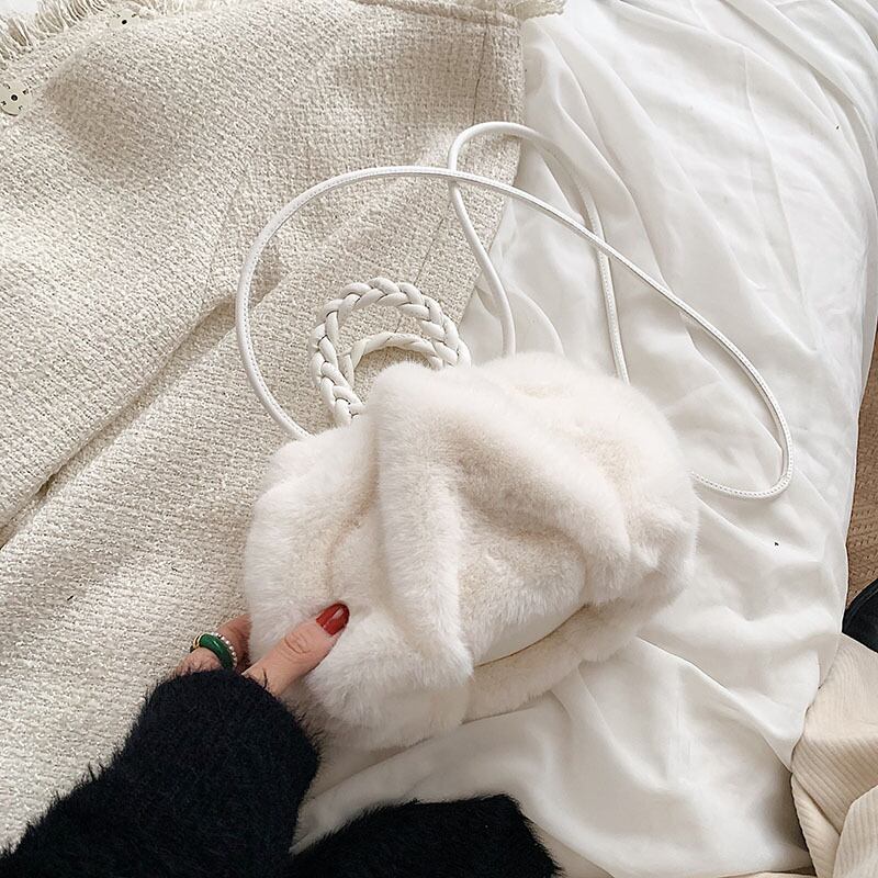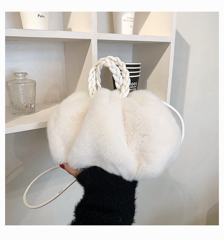ふわっふわのファーに編み込まれたハンドベルトの異素材MIXデザインのショルダータイプにもなるバッグ。ころんとしたフォルムが可愛らしく、シンプルながらも存在感ばっちりなアイテムです。