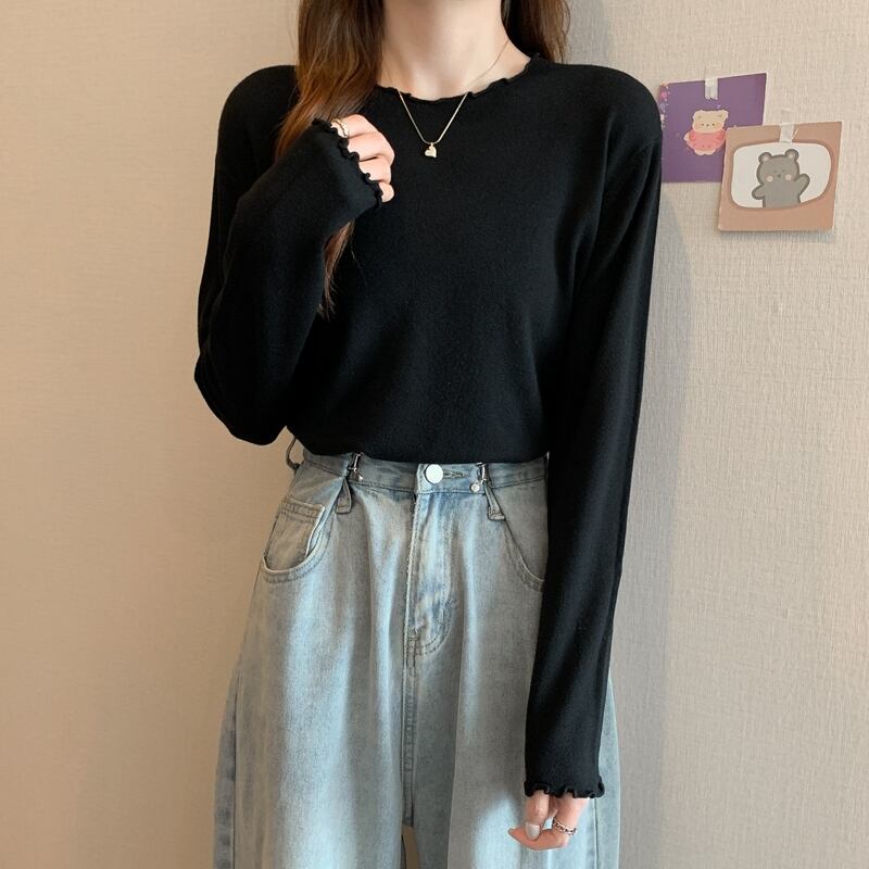 フリルの袖口と襟のトップスは、フェミニンでガーリーな印象を与えるアイテムです。長袖タイプは、春や秋にぴったりで、一枚で着ても、ジャケットやカーディガンのインナーとしても着回せます。また、二の腕をカバーしてくれるので、体型カバーにも効果的です。