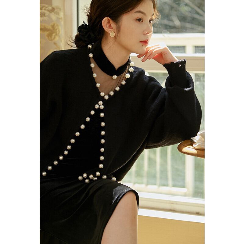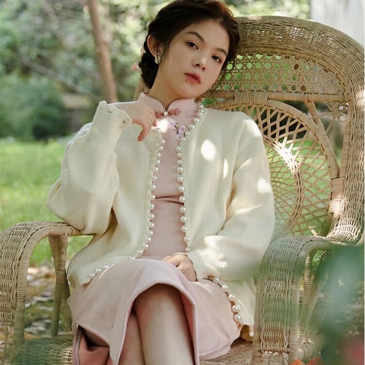 定番的なシンプルカーディガンに、パールがたおやかに光る大人な雰囲気漂う1枚。