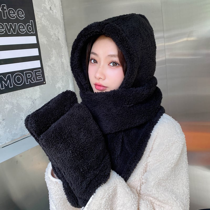 マフラーにはフードが付いており、フードをかぶることで、首元や頭部をしっかりと包み込み暖かさをキープします。