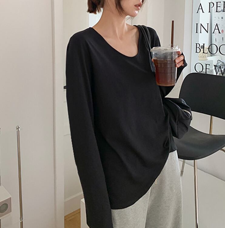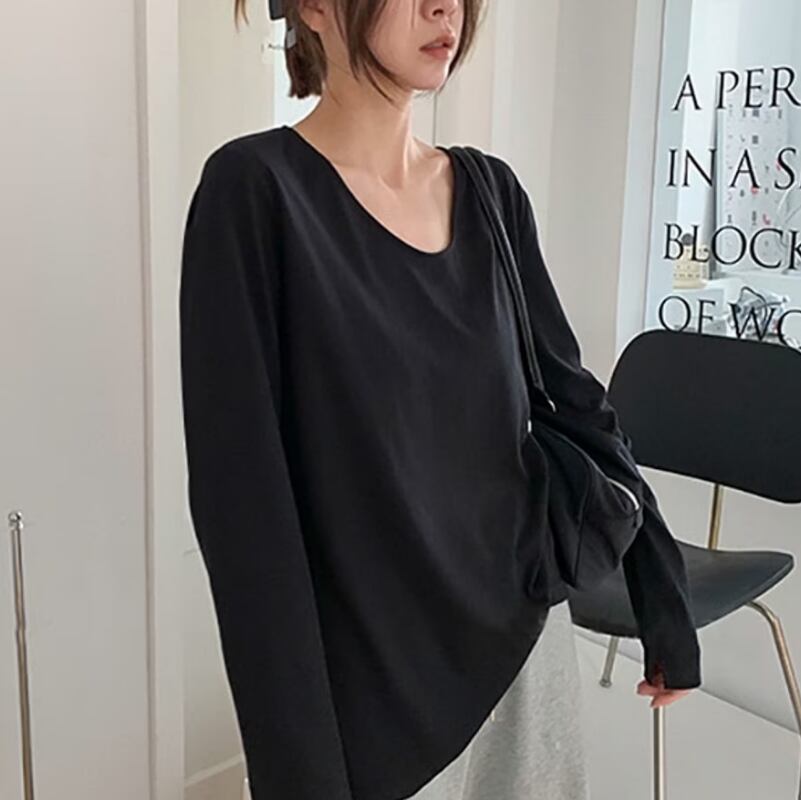 シンプルベーシックなロングTシャツになります。大きく開いたUネックラインが女性らしさを演出。大人可愛い長めの萌袖口にはユニークなスリットデザインを加えました。どんなボトムスとも相性が良い万能アイテムです。